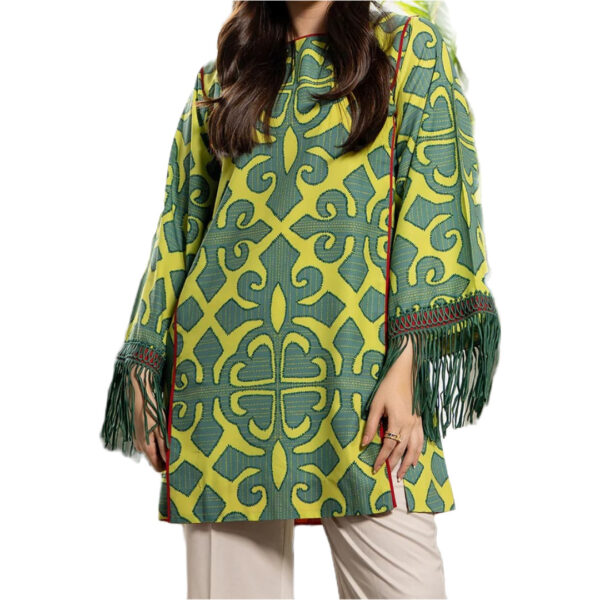 This shirt in soft crepe Fabric printed in relly pattern is masterpiece in itself. The eye closure printed on the fabric.